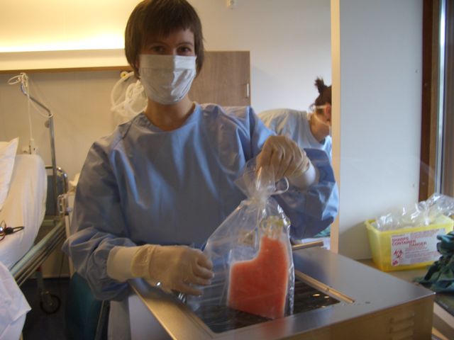 Mardi 30, c’était le jour de l’autogreffe. Les jours précédents, Pierre avait reçu une chimio haute dose pour tuer toute sa moëlle osseuse. Pour ceux qui s’en souviennent, Pierre avait précédemment subi un prélèvement de cellules souches au CHU Lg (cf la machine infernale). Ces cellules souches avaient été congelées à -160°C dans de l’azote liquide. Ci-dessous, la sortie de la poche congelée: