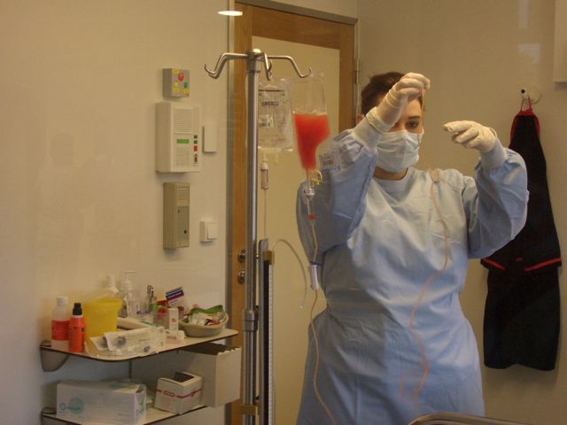 Préparation de la transfusion (qui n’a duré qu’une demi-heure) par Florence (c’est aussi elle qui nous a accueillis lors de notre entrée en chambre stérile):
